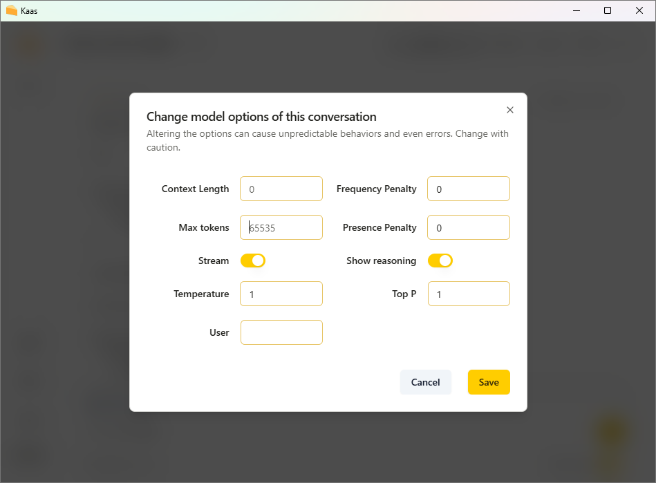 Поэтому, если вдруг Kaas внезапно впадает в состояние вечного «думаю‑думаю» или начинает сыпать загадочными ошибками, лечится это старым добрым шаманством: попробуйте покрутить параметры Default context length и Default max tokens — как глобально, так и в самом чате. В большинстве случаев эта магия действительно возвращает приложение к жизни.