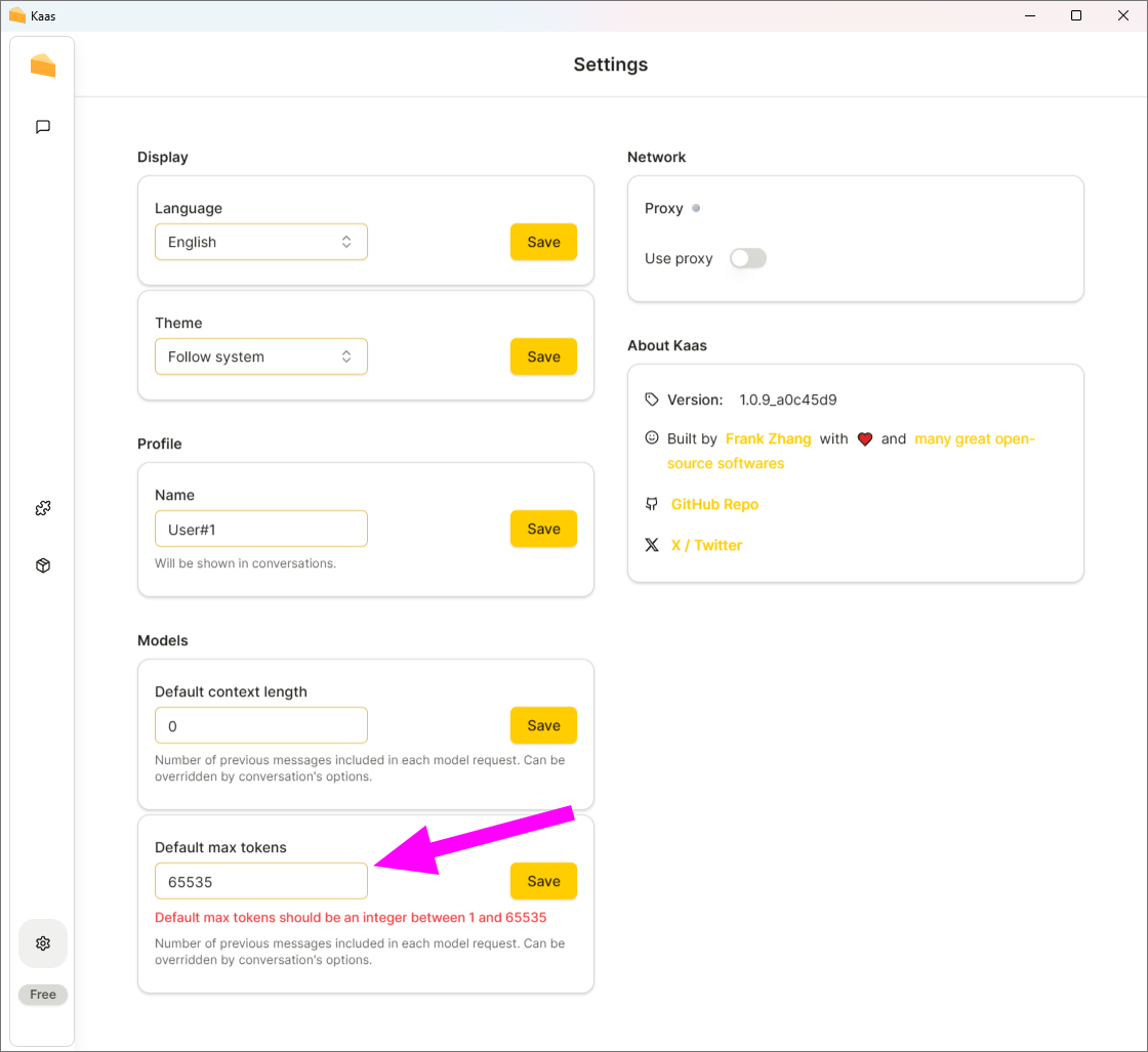 Чтобы избежать бага в Kaas, также нужно перейти в ⚙️ Settings и поставить в Default max tokens значение 65535.