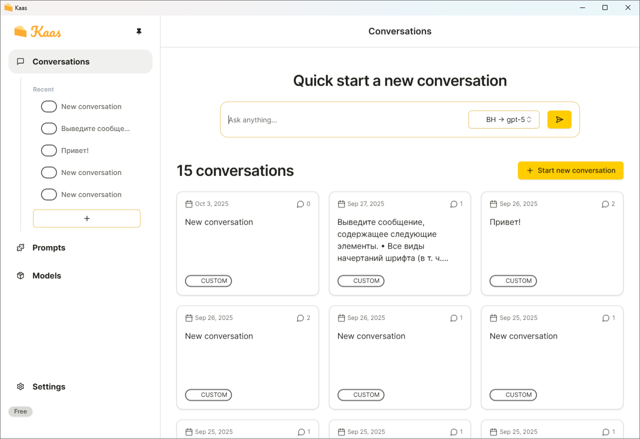 Kaas — настольный мультиплатформенный клиент для общения с ИИ через API. Работает на Windows, Linux и macOS.