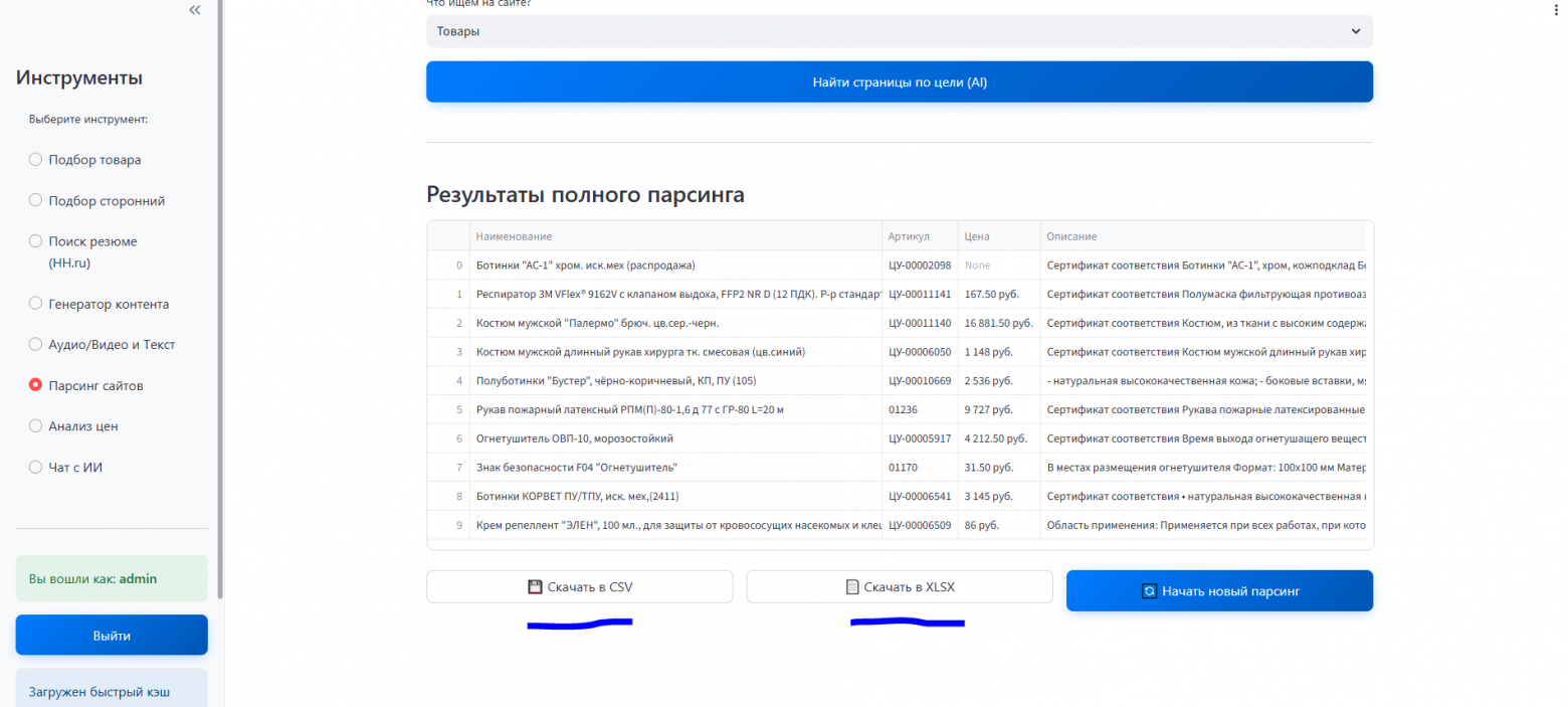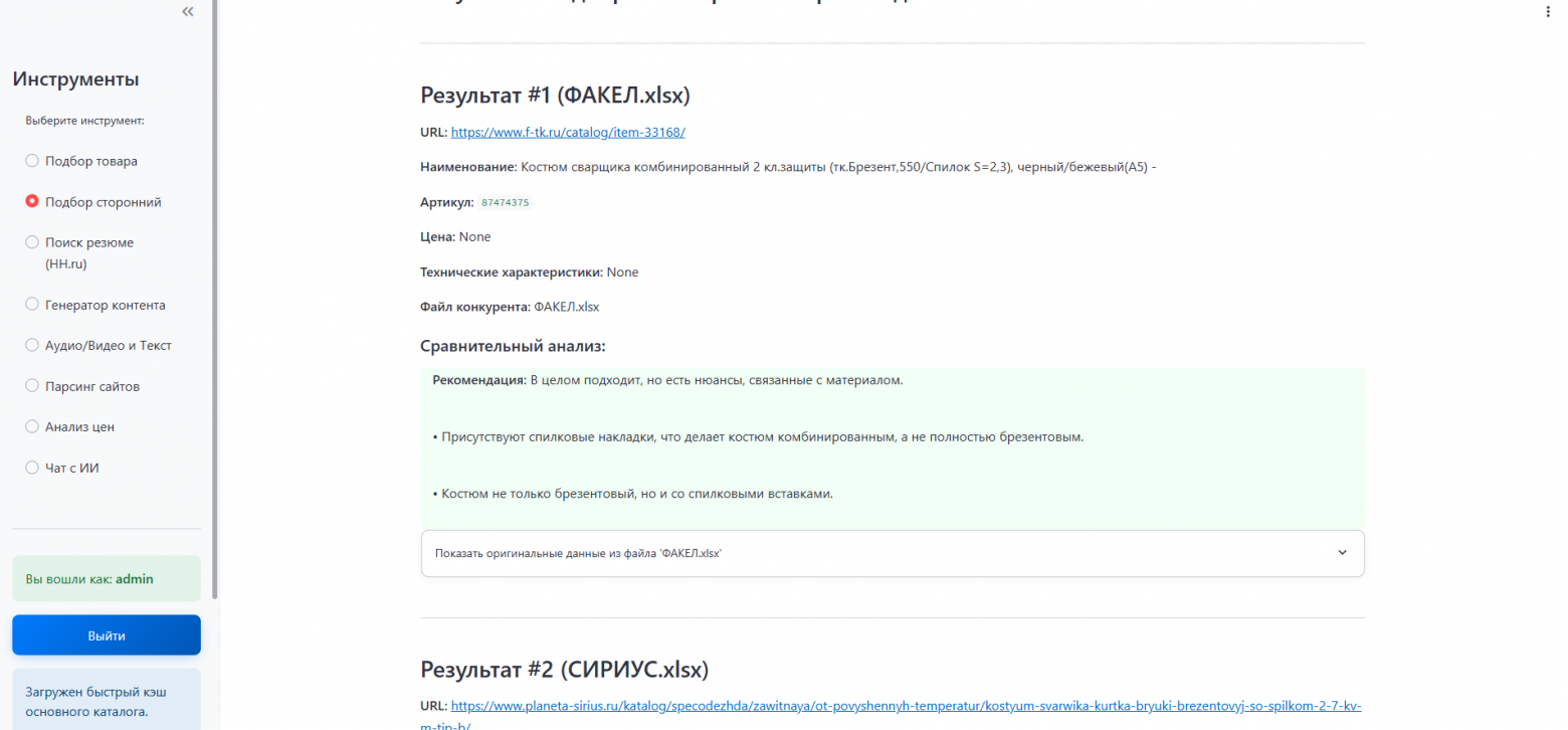 На финальном этапе происходит формирование и выгрузка результата. Все собранные данные собираются в единую таблицу pandas DataFrame, которая отображается в интерфейсе для предварительного просмотра. Рядом находятся кнопки для скачивания результата в форматах .xlsx или .csv. Эти файлы полностью готовы для дальнейшего использования: их можно загрузить в модуль «Анализ цен» или «Подбор по сторонним данным» (о котором я писал выше в статье). То есть я получил инструмент, который может практически без технических знаний парсинга собрать информацию с сайтов производителя/конкурента/поставщика, и тут же использовать эти данные для подбора товара по ним.