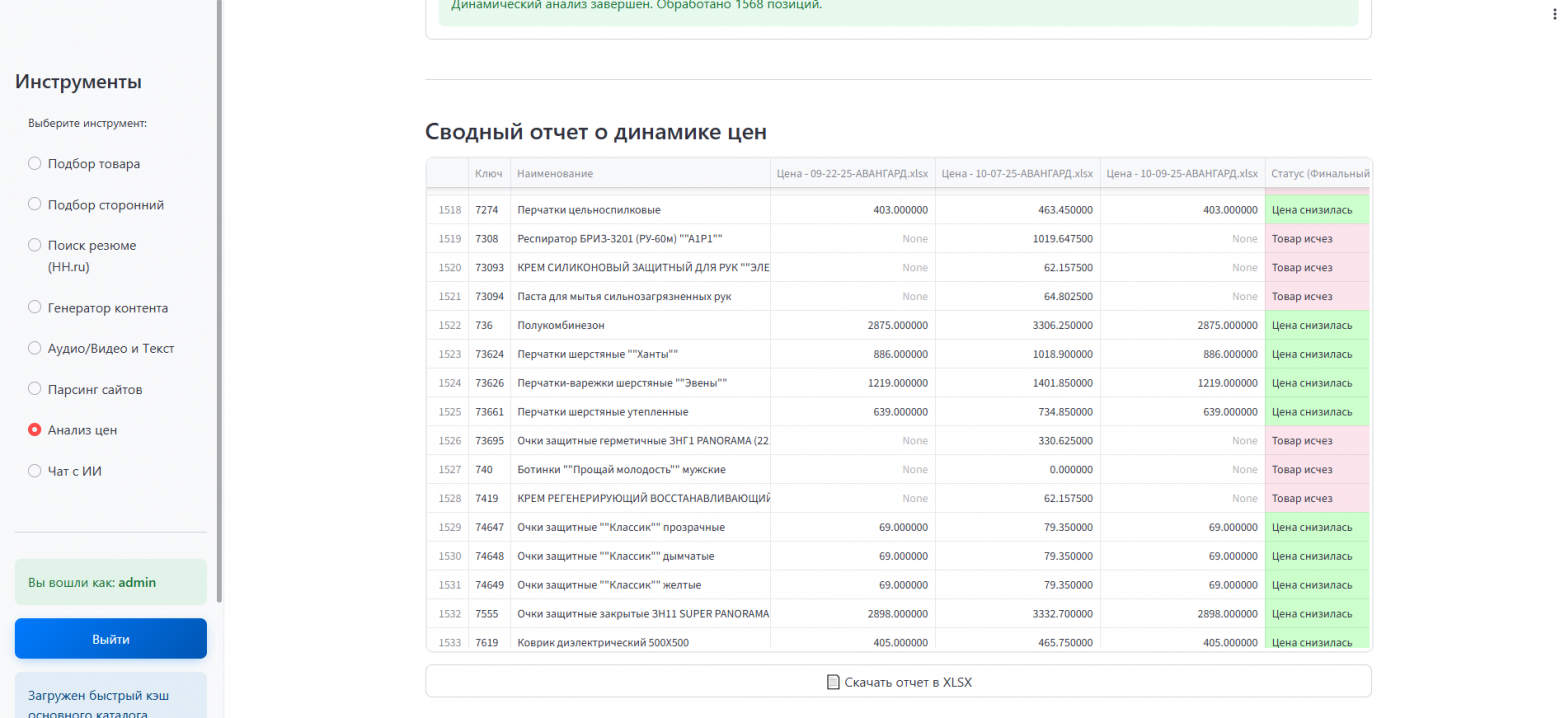 Финальный этап — визуализация и выгрузка отчета. Система строит отчет, располагая колонки в логическом порядке, и применяет условное форматирование. Ячейки в колонке "Статус" раскрашиваются в зависимости от значения: "Цена выросла" — в красный, "Цена снизилась" — в зеленый, "Новый товар" — в го��убой. Ячейки в колонке "Изменение, %" получают фоновый градиент от зеленого до красного. В итоге отформатированная таблица отображается в интерфейсе как наглядный аналитический дашборд. Рядом с ним расположена кнопка, позволяющая скачать этот отчет в формате .xlsx для дальнейшей обработки. ЕСЛИ ВКРАТЦЕ, то Анализ и сравнение цен – это автоматический ВПР в эксель с таким же автоматическим форматированием и добавлением некоторых данных. Да, это все можно сделать вручную, но я сделал это все в более удобном виде и в едином цифровом пространстве.