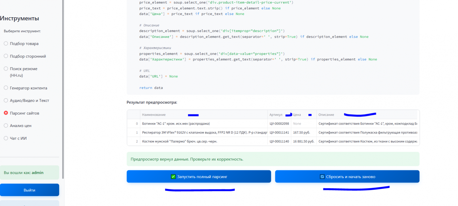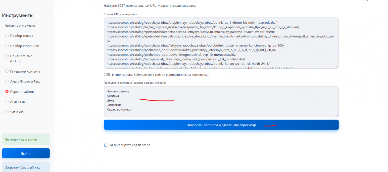 После этого наступает ключевой и самый технологичный шаг — генерация кода для парсинга с помощью ИИ. Пользователь нажимает кнопку "Подобрать алгоритм". Система автоматически скачивает HTML-код первой страницы из списка и отправляет его в Gemini вместе с перечнем полей и специальной инструкцией. ИИ анализирует структуру HTML-документа, находит, в каких тегах и классах содержится нужная информация, и генерирует готовый, работающий Python-код. Этот код система сохраняет в памяти для дальнейшего использования. Таким образом, сложнейшая часть парсинга полностью автоматизируется.