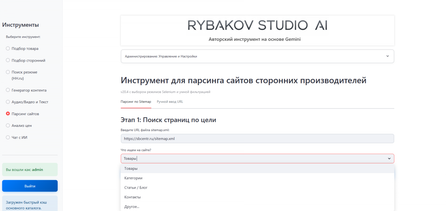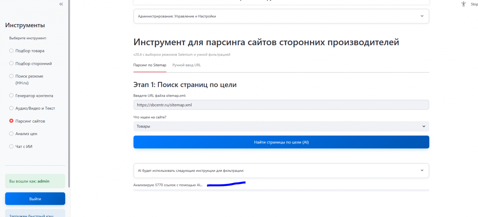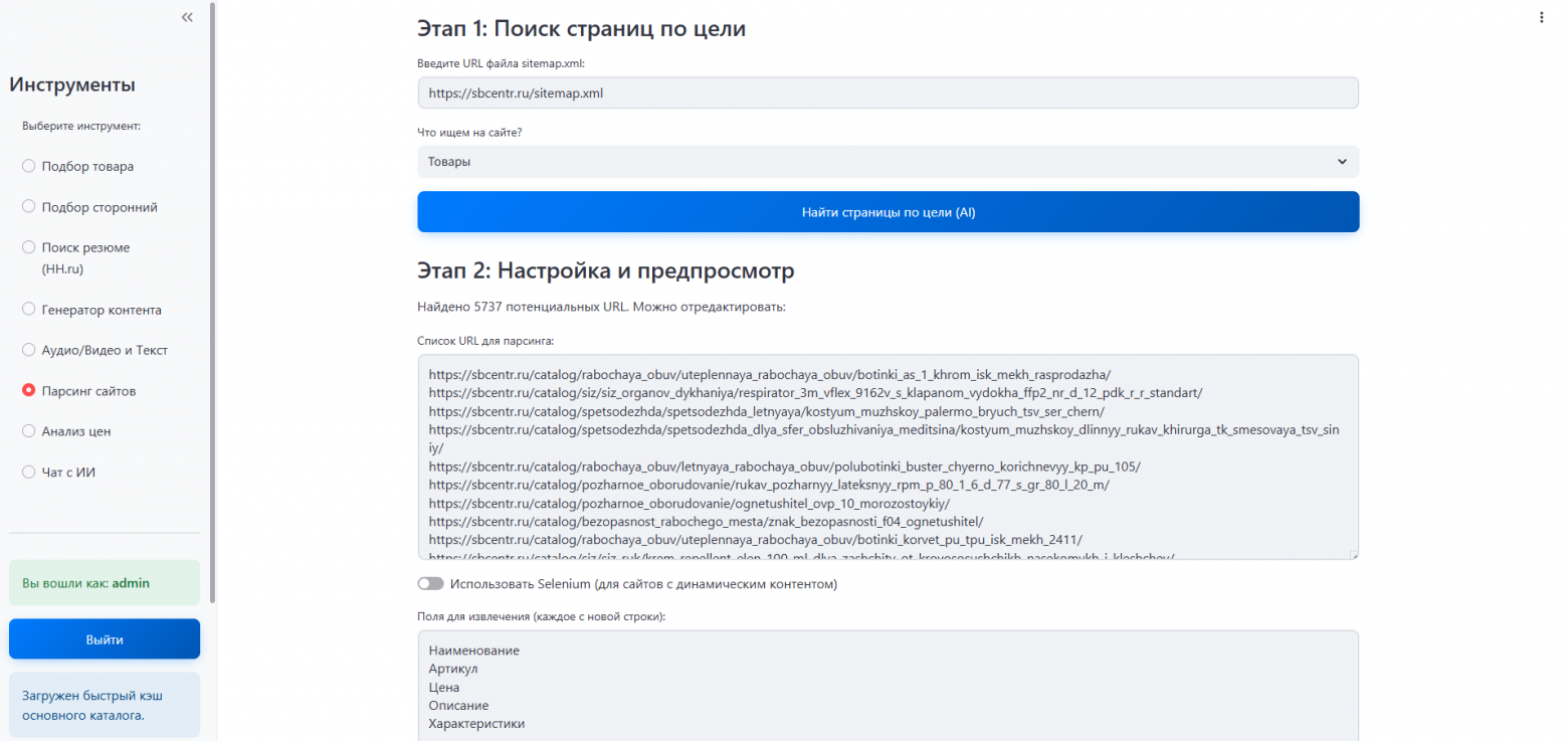 На этапе подготовки и настройки пользователь, не обладая техническими знаниями, фактически создает уникальную программу для парсинга конкретного сайта. Первым делом необходимо определить источники — составить список страниц для сбора данных. Простой путь — это ручной ввод ссылок. Но если товаров тысячи, это неэффективно. Поэтому основной путь — автоматический поиск через Sitemap (в статье буду рассматривать только работу во вкладке парсинг по сайтмеп, так как принципиально работа инструментария отличается только как мы собираем ссылки). Пользователь указывает ссылку на "карту сайта" (sitemap.xml), и система скачивает ее. Чтобы отделить "зерна от плевел", этот огромный список URL отправляется в ИИ-модель, которая получает четкую инструкцию отфильтровать только те ссылки, которые похожи на страницы товаров, и удалить все служебные. Так из нескольких тысяч ссылок система получает точный (ну или почти точный) список целевых страниц товаров. СРАЗУ оговорюсь, парсить моим инструментом я могу не только страницы товаров (статьи, контакты и прочее)