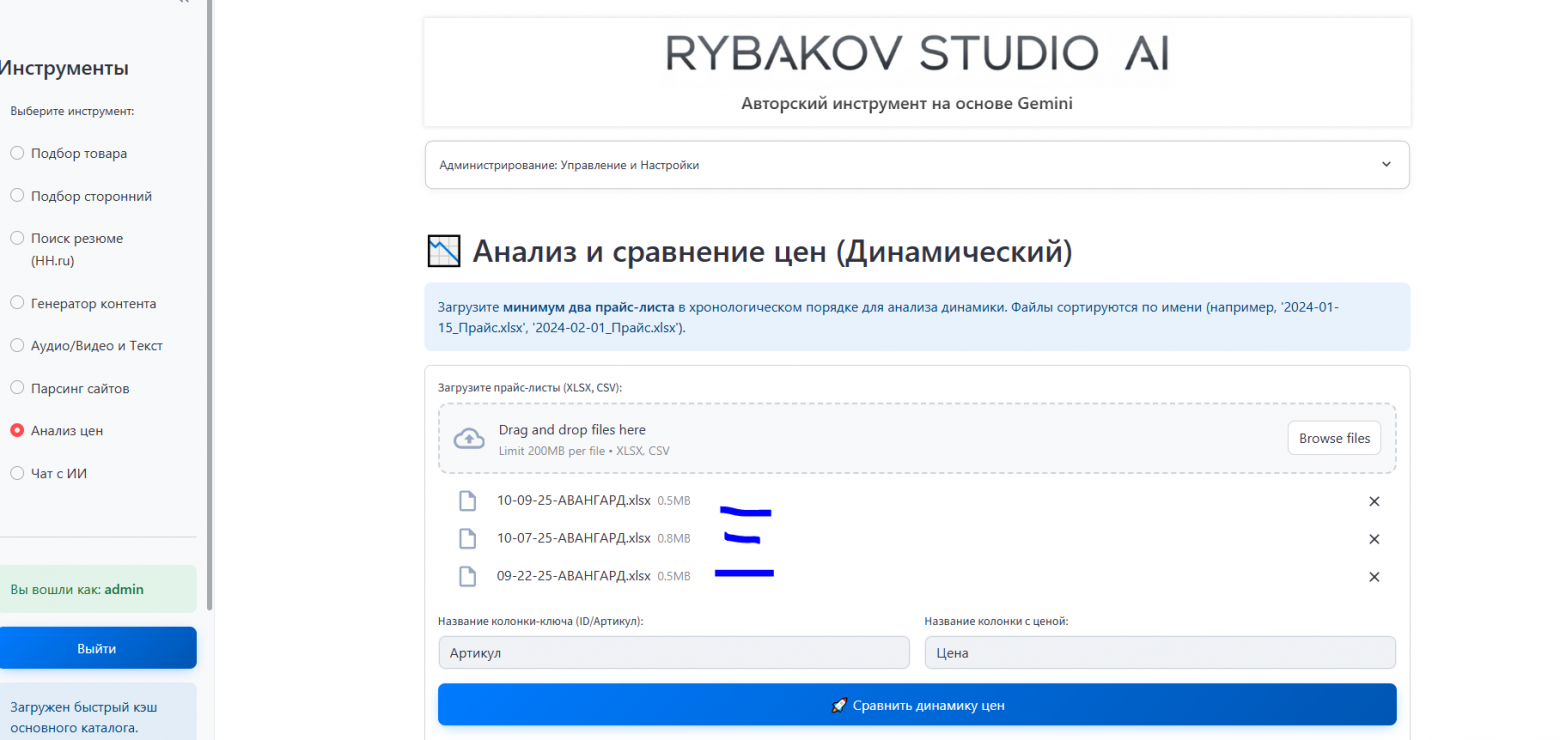 На этапе загрузки и подготовки данных система собирает все исторические данные в единую структуру, пригодную для сопоставления. Процесс начинается с выбора и загрузки файлов пользователем. В интерфейсе он загружает как минимум два файла, которые представляют собой срезы данных за разные даты. Важным требованием является именование файлов таким образом, чтобы их можно было отсортировать в хронологическом порядке. Система использует имена файлов для их автоматической сортировки. Далее пользователь указывает, какая колонка содержит уникальный идентификатор товара, а какая — цену.