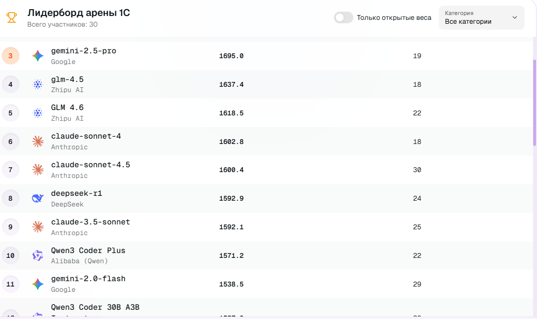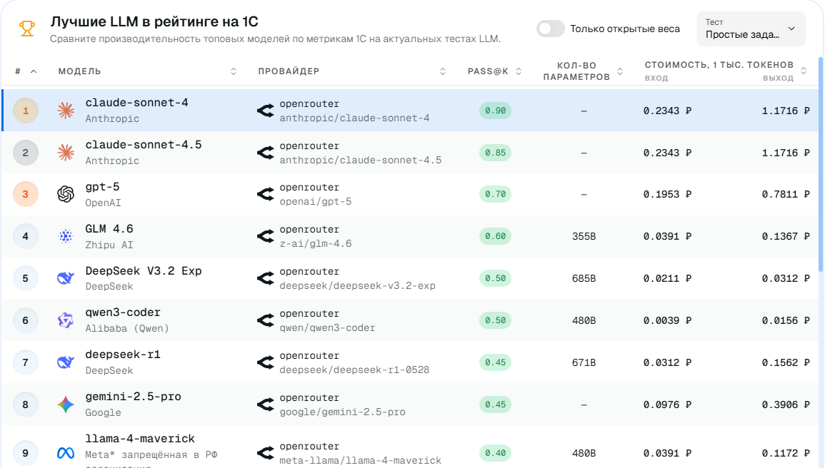 Очевидно что сильный "плевок в морду" Anthropic, потому что они "делают новые модели хуже чем старые" (нет). Совсем неуместный в рейтинге для 1С gpt-5 (даже не codex) и gemini 2.5 только 8-й в "рейтинге" проигравший аж двум deepseek. Claude Opus 4.5 вообще отсутствует как и Gemini 3. Хотя вышли достаточно давно по меркам современного мира