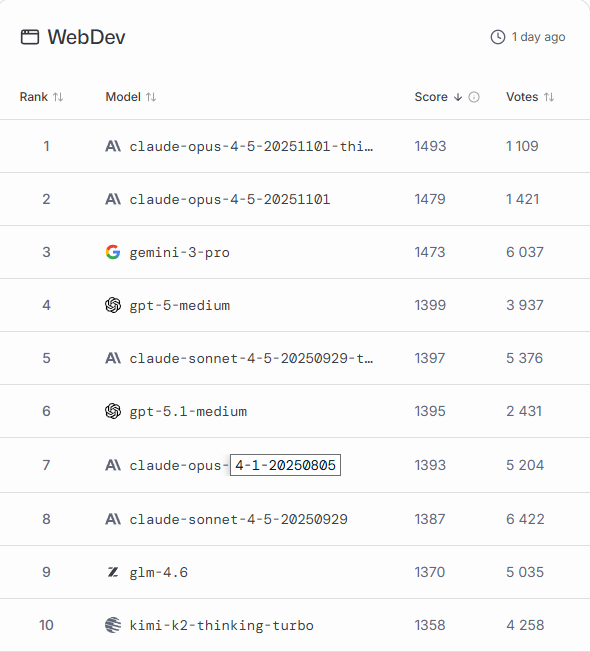 Есть новые модели, но опять "камень в огород" Anthropic, которые зачем то выпускают модели новые хуже предыдущих (ни в коем случае нет!) и zAI (где 4.6 прямо очень существенно лучше 4.5) ну и результаты с количеством битв 19-20 конечно совсем не релевантны для такого способа оценки. Заметьте - количество оценок и количество "битв" это о разном. "Битва" это 1/N оценки, где N - число моделей по сути.