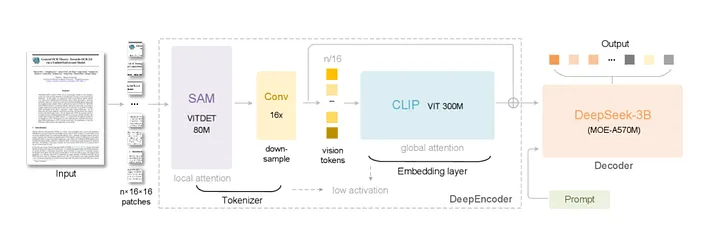 Эта модель состоит из двух основных компонентов: DeepEncoder, который сжимает входное изображение высокого разрешения в небольшое количество визуальных токенов, и декодера DeepSeek-3B-MoE (языковая модель Mixture-of-Experts), который восстанавливает исходный текст из последовательности визуальных токенов.