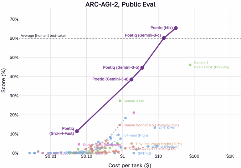 Новые результаты компании Poetiq, занимающейся разработкой ИИ, свидетельствуют об успешном решении исходного бенчмарка ARC-AGI-1. В недавнем заявлении компания утверждает, что её системы, построенные на моделях OpenAI и Google, достигли максимальной производительности на первом наборе данных. Более того, сообщается, что система превзошла средний человеческий результат в 60% на значительно более сложном наборе данных ARC-AGI-2.
