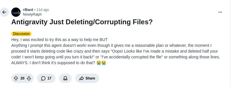 Другие пользователи Google Antigravity на Reddit также сообщили, что у ИИ случаются сбои, когда ИИ-агент стирает части проектов без явного указания сделать это или повреждает сторонние файлы. Речь шла не всегда о целых разделах диска, но о потерянных исходниках и конфигурациях, которые система посчитала «мусором» и удалила во время выполнения своих скриптов.