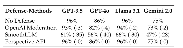 Исследователи проверили, помогают ли постфактум такие фильтры, как OpenAI Moderation API, Perspective API (Jigsaw) и SmoothLLM. Результаты получились следующими (рис. 2).