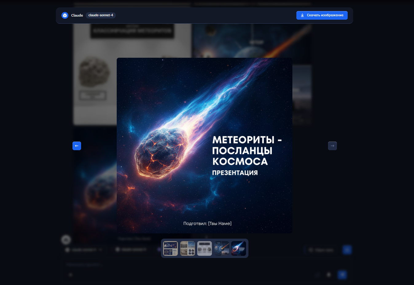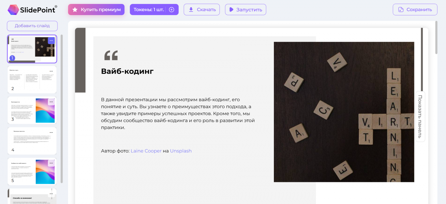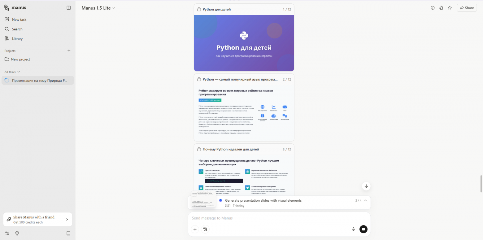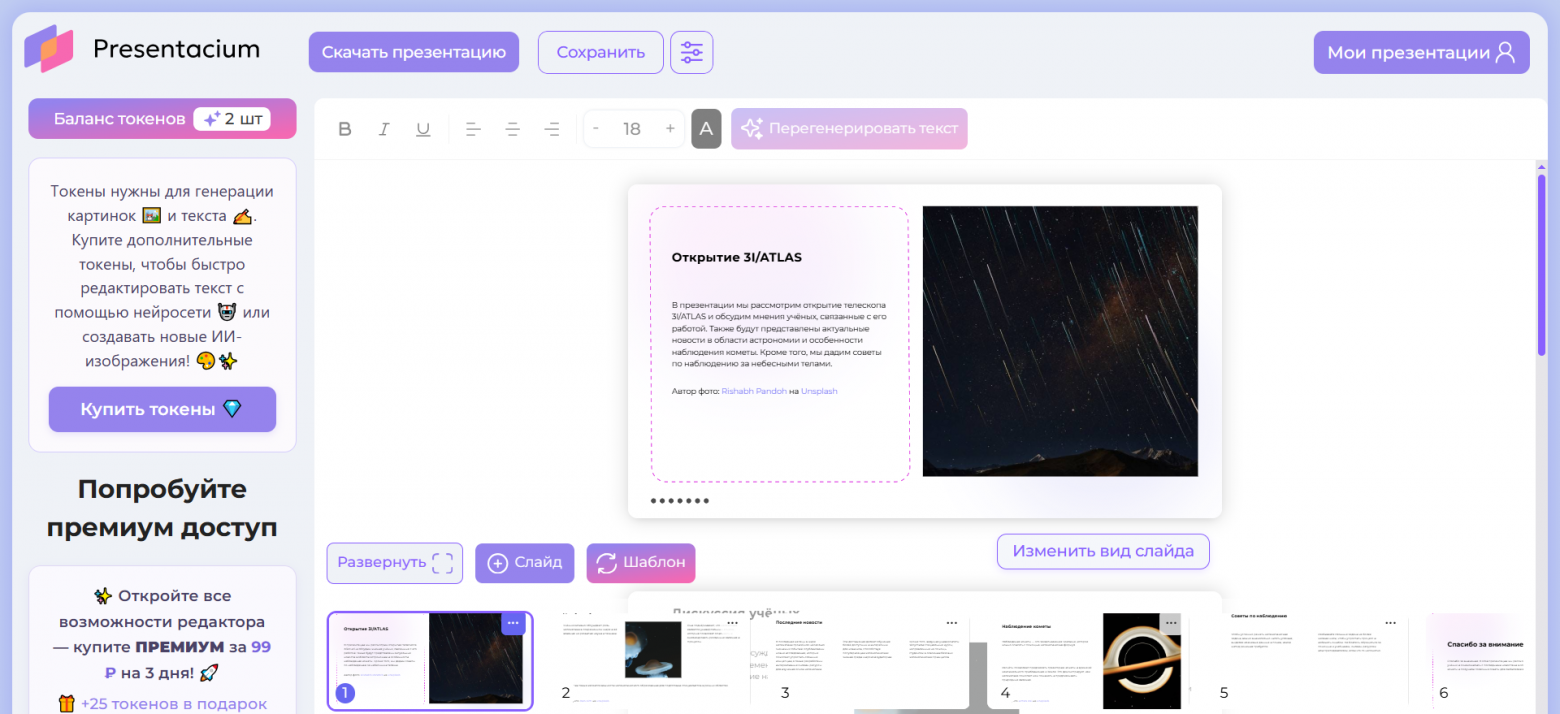 В сервисе каждый день даётся 300 кредитов + 1000 при регистрации, еще + 500, если отправите другу. Он сам ищет информацию в интернете, пишет текст презентации и подбирает картинки из открытых источников, но можно попросить его создать изображения. Генерация заняла 5 минуты (4 слайда).