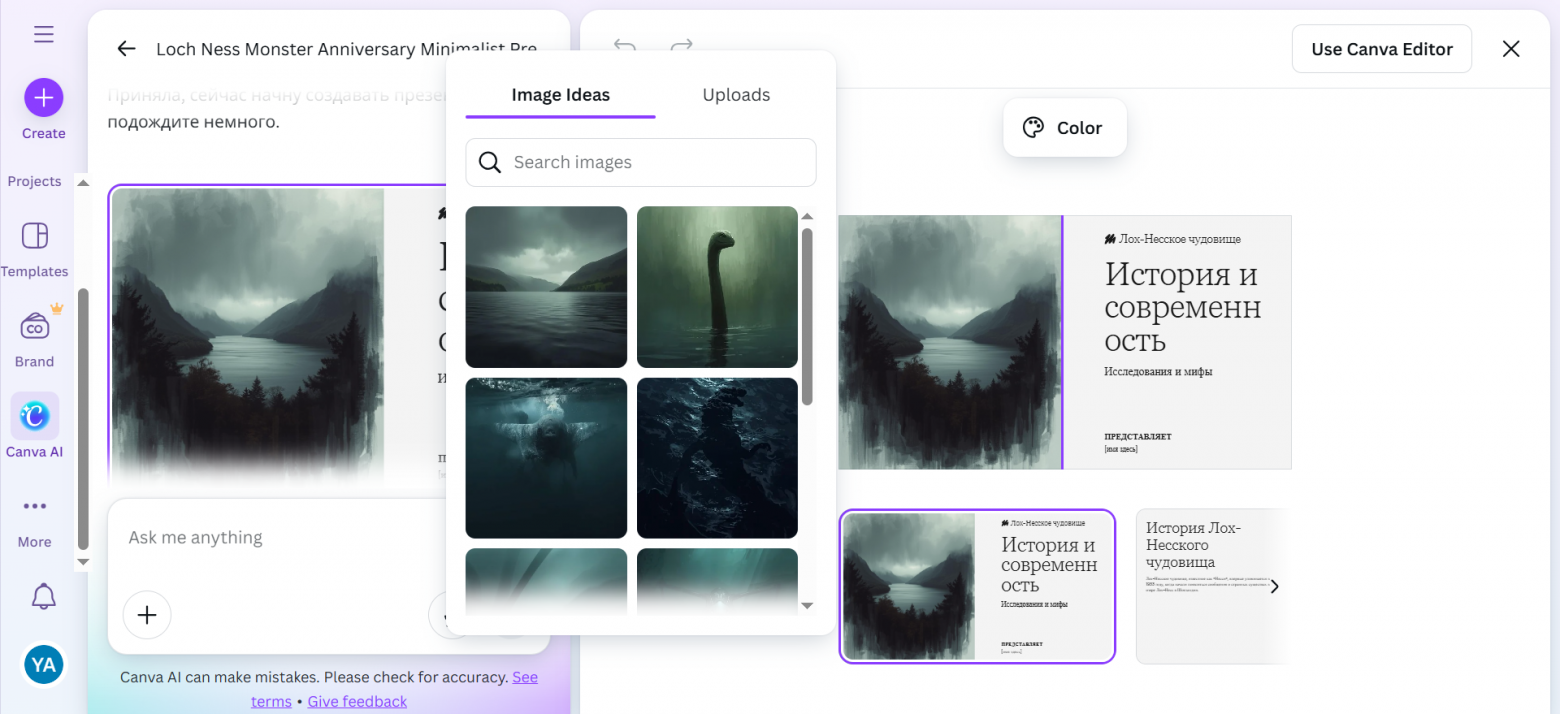 Один из самых популярных графических редакторов с Magic Design (генератором презентаций с ИИ). Сервис не создает контент с нуля, а только помогает с визуалом. Вы вставляете тест, а ИИ подбирает для него картинки и целевую аудиторию.