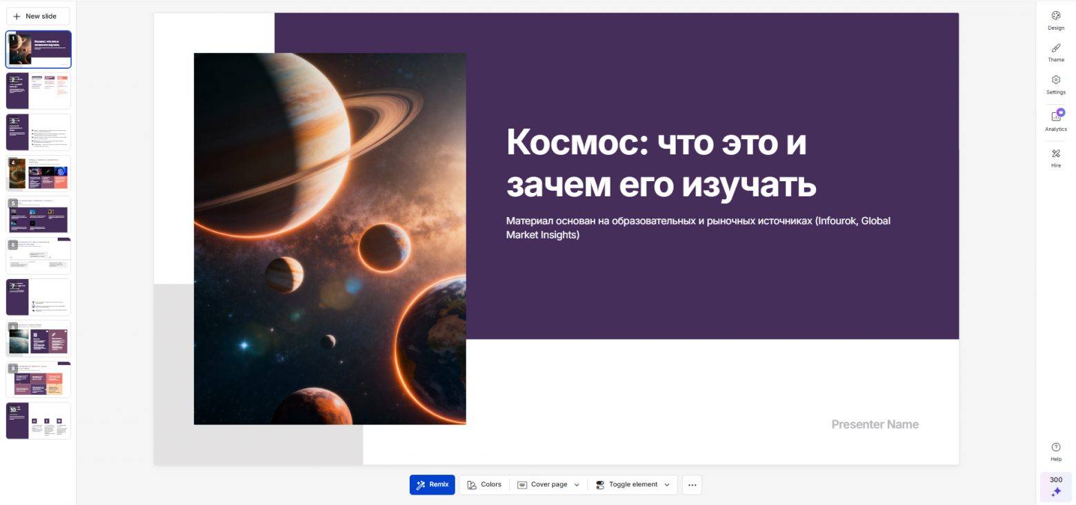 Результат можно редактировать или переверстать отдельный слайд с помощью функции Remix. И главный минус - экспорт. Он доступен только по подписке за $6. Вы можете поделиться только web версией!