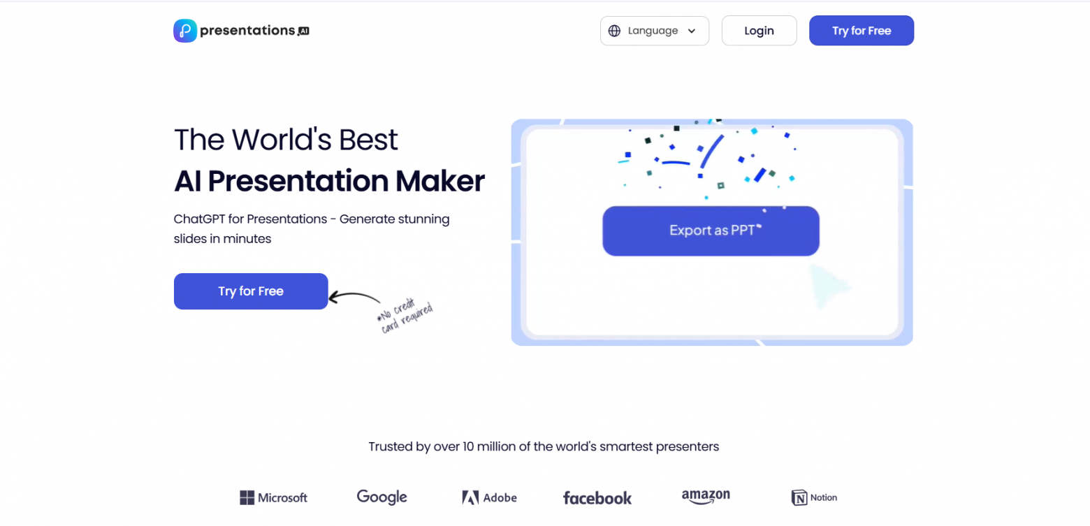 Экспорт презентации доступен в формат PDF. Также сервис понимает русский язык, но текст генерирует на английском. Чтобы получить результат на русском, нужно загрузить на нем текст или дать источник с текстом на русском.