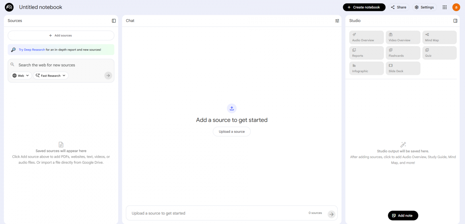 Это AI-инструмент от Google, призванный помочь работать с документами: загружать PDF, Google Docs, сайты, слайды и конспекты, а затем задавать вопросы, получать пояснения, создавать конспекты и аудио-версии обзоров на основе своих источников.