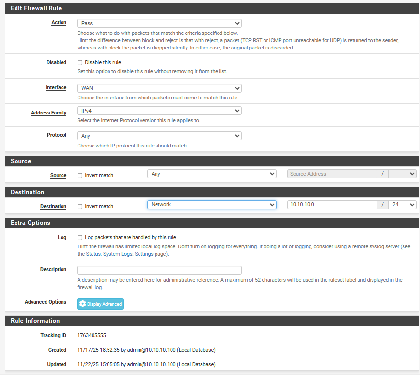 Первое, что я сделал, это создал правило, чтобы любой трафик из любой сети мог достигнуть жертв в изолированном сетевом диапазоне 10.10.10.0/24,
