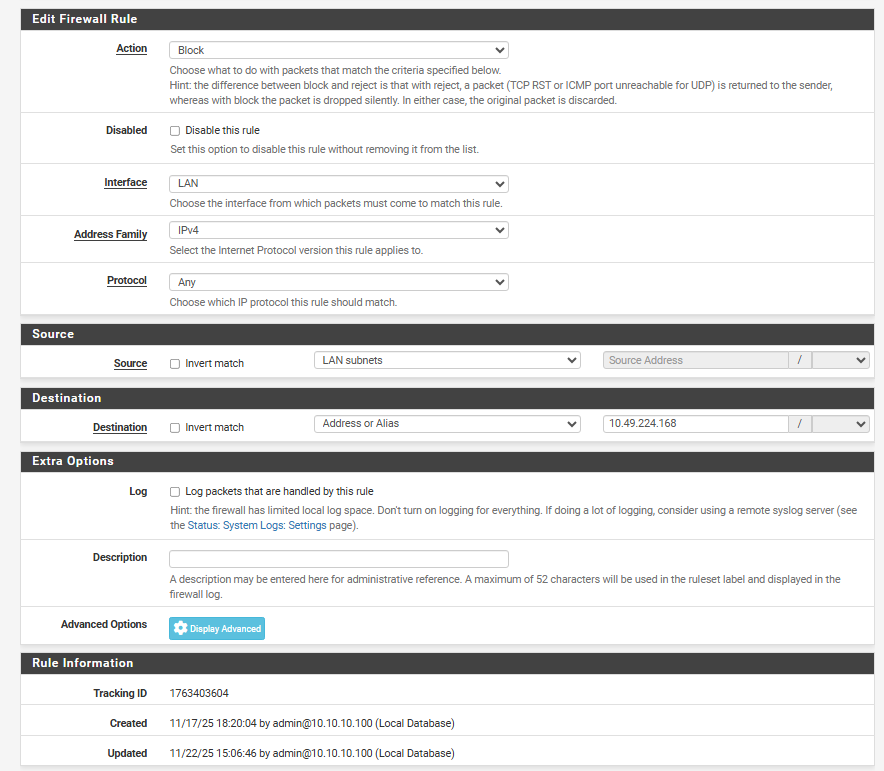 Теперь нужно задать последнее и самое главное правило: если трафик идёт из LAN-сети и направлен в сторону ip хоста, то мы его блокируем.