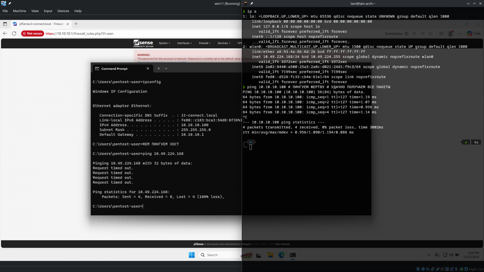 Захожу на хост и пишу в терминале ip a, чтобы узнать локальный ip-адрес хоста, после чего на винде я пытаюсь пинговать его, и я удачно получил все отправленные пакеты. Это значит, сеть не изолирована, то есть в лабе нет смысла. Затем я попробовал пропинговать windows через свой хост, и всё стало еще страннее, ведь я не мог получить ответа от винды...