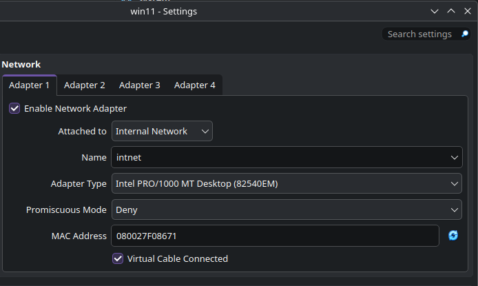 Я отчаялся настолько, что решил скачать Virtual Box, который я лично недолюбливаю, но вспомнил, что там есть режим NAT‑Network, который, по идее, должен решить мою проблему. Скачал туда ту же винду, дал ей адаптер вида NAT‑Network, но проблема никуда не делаcь, виртуальная машина удачно пингует и получает ответ от хоста, как и раньше.