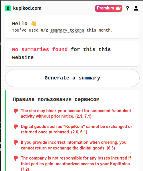 Недавно посмотрел видео про скандал вокруг сервиса Kupikod. Если кто не в курсе, это контора, продающая ключи для игр. Хозяева данного заведения придумали отличную идею - уронить комиссии за пополнение кошелька до нуля, а радостных пользователей долбить скрытой ежемесячной подпиской размером в 300 рублей, которая автоматически оформляется при пополнении кошелька на сумму, большую определенной. И разумеется, нигде на сайте инфы об этой подписке не было. И разумеется, если эту подписку не отменить, то с тебя так каждый месяц и будет списываться по 300 рублей. Правда, эта подписка не была прям супер секретной - информации о ней была указана в публичной оферте, том самом документе, который никто никогда не читает, но с которым все всегда согласны. Собственно вот этот пункт: