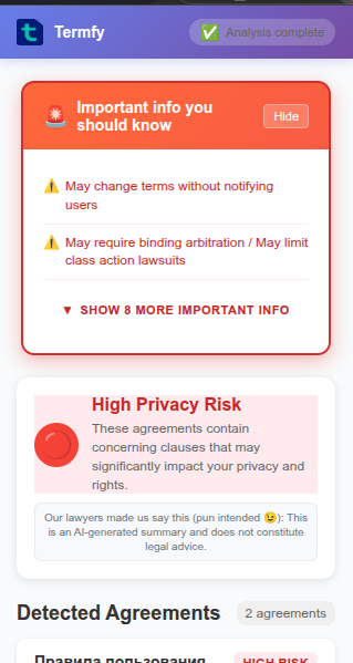 на популярных сайтах автоматически выдает список предупреждений относительно их пользовательских соглашений
