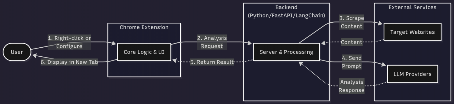 Приложение состоит из двух частей: собственно расширение для Хрома и бэкенд. Бэкенд написан на Python + FastAPI + LangChain.