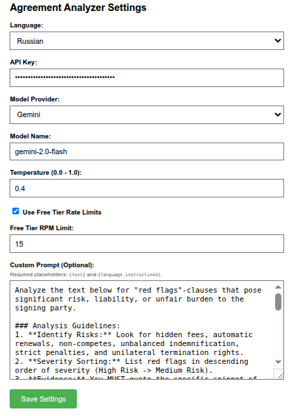 пользователь предварительно задает ключ API, язык, настройки LLM и промпт для анализа соглашения (если промпт не задан, то используется промпт по умолчанию из файла prompts.py бэкенда); окно с настройками выглядит так: