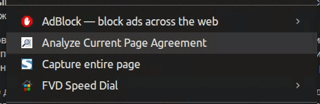 пользователь кликает правой кнопкой мыши на ссылку или страницу с договором/соглашением/офертой и выбирает в выпадающем меню пункт анализа соглашения