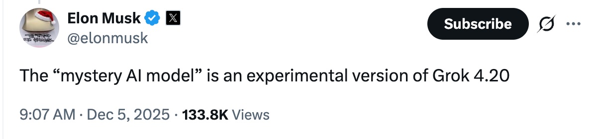 В ответ на твит блогера Wes Roth Маск написал: "The "mystery AI model" is an experimental version of Grok 4.20". Получается, xAI выставила на соревнование сразу две модели — публичную и секретную. Публичная заняла последнее место, секретная — первое.