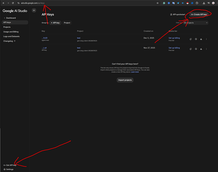 Click Create API Key, give it a name, select a project (or create one), and copy the key.
